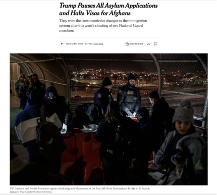 △《纽约时报》报道,特朗普政府目前暂停了对所有庇护申请的审批,并停止了向阿富汗人发放签证。